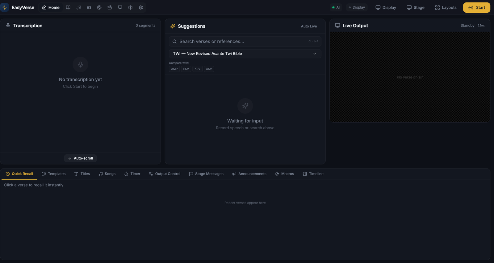 EasyVerse listens to the sermon through your microphone, transcribes speech in real-time, and instantly detects Bible references. Matching verses appear with confidence scores — click to display or let auto-live mode handle it.